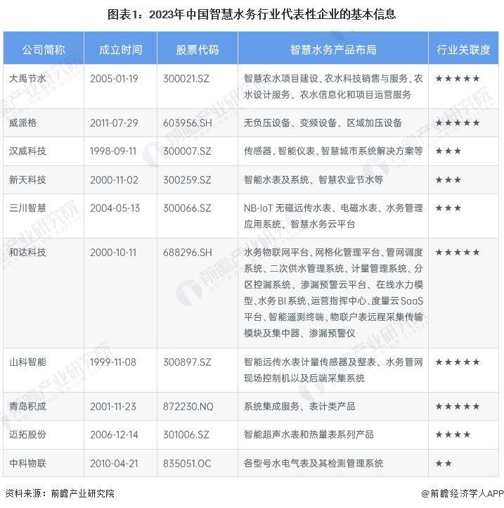 國內智慧水務行業發展時間短,智慧水務綜合解決方案提供商數量少。目前我國智慧水務行業不同類型的細分產品品類較多,不同企業各有其側重產品。我國智慧水務行業的上市公司包括:大禹節水(300021.SZ)、威派格(603956.SH)、漢威科技(300007.SZ)、新天科技(300259.SZ)、三川智慧(300066.SZ)、和達科技(688296.SH)、山科智能(300897.SZ)、青島積成(872230.NQ)、邁拓股份(301006.SZ)、中科物聯(835051.OC)。