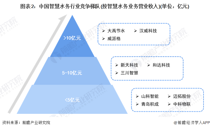 依據智慧水務業務營業收入劃分,我國智慧水務企業可分為3個競爭梯隊。其中,營收規模大于10億元的企業有大禹節水、威派格和漢威科技;營收規模在5-10億元之間的企業有新天科技、三川智慧、和達科技;山科智能、青島積成等企業的智慧水務營收規模在5億元以下。