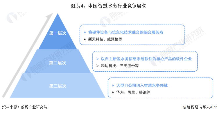從競爭層次來看,中國智慧水務行業的企業主要分為三個類型,一類是以儀器儀表和自動供水設備等水務信息化硬件產品為核心產品及主要收入來源的設備生產商,通過設備與信息化技術融合為水務企業客戶提供水務信息化服務,這類企業以上市公司新天科技、威派格為代表;第二類是以自主研發水務信息系統軟件為核心產品的專業領域軟件企業,即通過自主研發的軟件系統、嵌入式軟件智能終端集成外采的傳感器、儀器儀表及自動化設備為水務企業提供水務信息服務,該類企業以和達科技、三高股份、易維信息為代表;第三類是近年來加快布局智慧水務業務的大型IT公司,如華為、騰訊、阿里等,這些公司有云平臺和大數據分析等基礎技術的優勢。