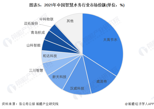 目前,中國智慧水務行業三大龍頭企業是大禹節水、威派格和漢威科技。從市場份額來看,2021年,全國智慧水務行業銷售收入為102.9億元,其中大禹節水的智慧水務業務營業收入達35.15億元,市占率為34.16%,排名第一;威派格和漢威科技的智慧水務業務營業收入為12.64億元和11.99億元,市占率分別為12.28%和11.65%;其余企業市場份額均低于10%。