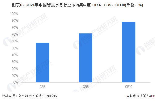 總體來看,我國智慧水務行業的市場集中度較高。2021年,我國智慧水務行業前三家企業營業收入集中度為58.1%,前五家企業營業收入集中度為71.5%,前十家企業營業收入集中度為88.45%。