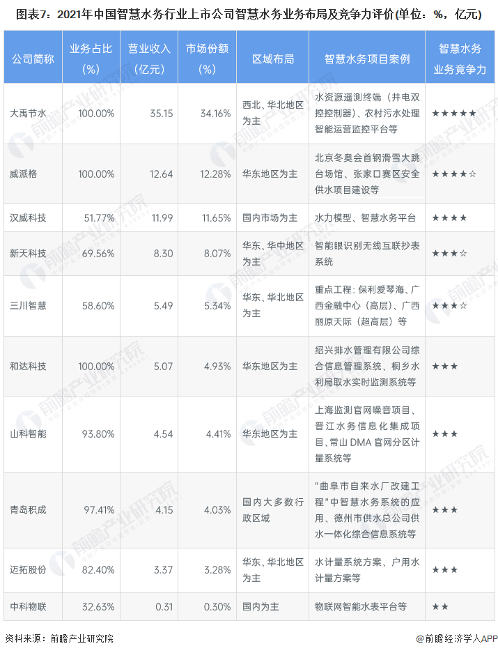 從企業智慧水務業務的競爭力來看,大禹節水的競爭力排名較強;其次是威派格、漢威科技,也是領先的智慧水務企業。