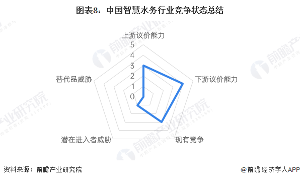 根據以上分析,對各方面的競爭情況進行量化,5代表最大,0代表最小,中國智慧水務行業的競爭情況如下圖所示: